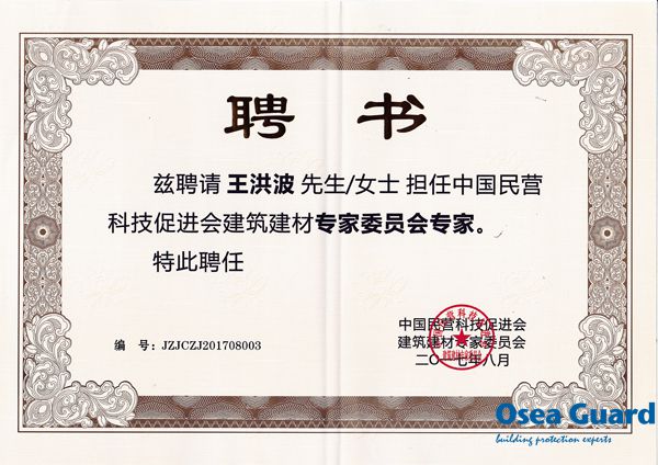 2017年8月26日第三屆全國建筑建材民營企業(yè)科技創(chuàng)新發(fā)展大會暨建筑建材專家論壇在雄安新區(qū)白洋淀凱盛國賓度假村隆重召開。 歐西建科總經(jīng)理王洪波和渠道部經(jīng)理李勇應(yīng)邀出席參加會議,會上王洪波總經(jīng)理當(dāng)選為中國民營科技促進(jìn)會建筑建材專家委員會副理事長并獲得了中國民營科技促進(jìn)會建筑建材專家委員會專家委員會專家聘書。