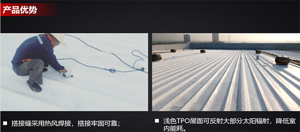 2.6、TPO維修專用 產品執(zhí)行標準--GB 18173.1-2012 卷材長20米寬2米;搭接邊10公分;厚度0.8+覆布;重量:0.8KG/㎡ 輔料:水泥基面用水泥粘結膠料和鋼屋面用氯丁膠、固定用壓條、鋼釘。