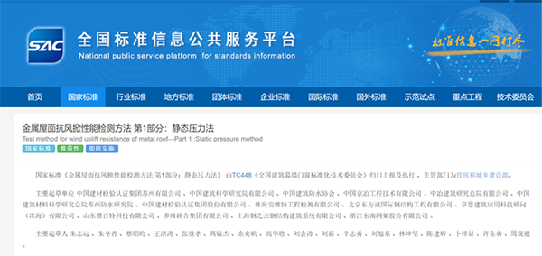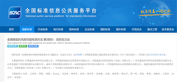 國家標準《金屬屋面抗風掀性能檢測方法 第1部分:靜態(tài)壓力法》發(fā)布于2021年3月9日,將于2021年10月1日實施。國家標準《金屬屋面抗風掀性能檢測方法 第2部分:動態(tài)壓力法》發(fā)布于2021年3月9日,將于2022年2月1日實施。