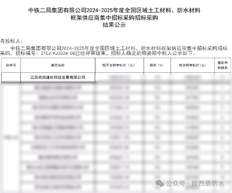 近日,中鐵二局集團(tuán)有限公司完成了2024—2025年度全國區(qū)域土工材料、防水材料框架供應(yīng)商集中招標(biāo)采購招標(biāo),并公示了相關(guān)結(jié)果,其中,江蘇歐西建材科技發(fā)展有限公司成功入列。