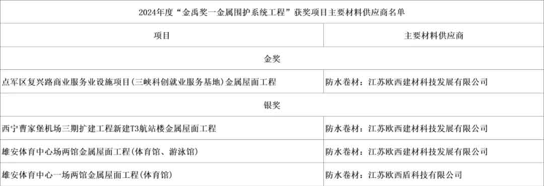 在2024年度建筑防水行業(yè)的重磅評選——“建筑防水行業(yè)科學技術獎—工程技術獎(金禹獎—金屬圍護系統(tǒng)工程)”中,歐西盾防水卷材成功入選獲獎項目主要材料供應商名單。該獎項由中國建筑防水協(xié)會與《中國建筑防水》雜志社聯(lián)合評定,是全國金屬圍護系統(tǒng)行業(yè)優(yōu)秀工程項目的至高榮譽,每年評定一次,旨在表彰行業(yè)內最頂尖的工程項目與材料供應商。此次榮獲獎的四個項目,無一不是行業(yè)內的標桿性建筑,而它們背后都有著歐西盾防水卷材的堅實支撐。