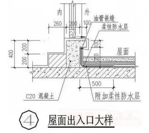 屋面出進(jìn)口因使用頻繁會組成提早粉碎,出進(jìn)口處防水層收頭應(yīng)處置妥貼,除外,應(yīng)適當(dāng)作加強層,并要求外觀作防水層,如水泥沙漿防水層等。