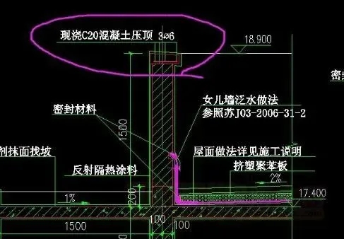 壓頂處于屋面的最高處,直接暴露于自然狀況中,受天氣影響大,受整個縱向墻體溫差、構(gòu)造受力變形及墻體混凝土和沙漿干縮變形的影響也很大,因而即便是配筋混凝土壓頂,其橫向破綻也是不可避免的。多在3~5年內(nèi)破綻均會鮮明地展開,配筋混凝土壓頂,在5~8m以內(nèi)就會有1條破綻展開,不配筋混凝土在1m支配就有1條破綻。雨水順破綻到墻內(nèi),繞過防水層漏到室內(nèi),以是壓頂必需作柔性涂料加強層。普通是作在壓頂下,假定選材不當(dāng),或許會組成壓頂和女兒墻分層,目前只需聚合物水泥基涂料和聚合物水泥沙漿概略用于此處防水;另一種是將防水層作在壓頂下面,采取卷材粘貼或用涂料涂刷。